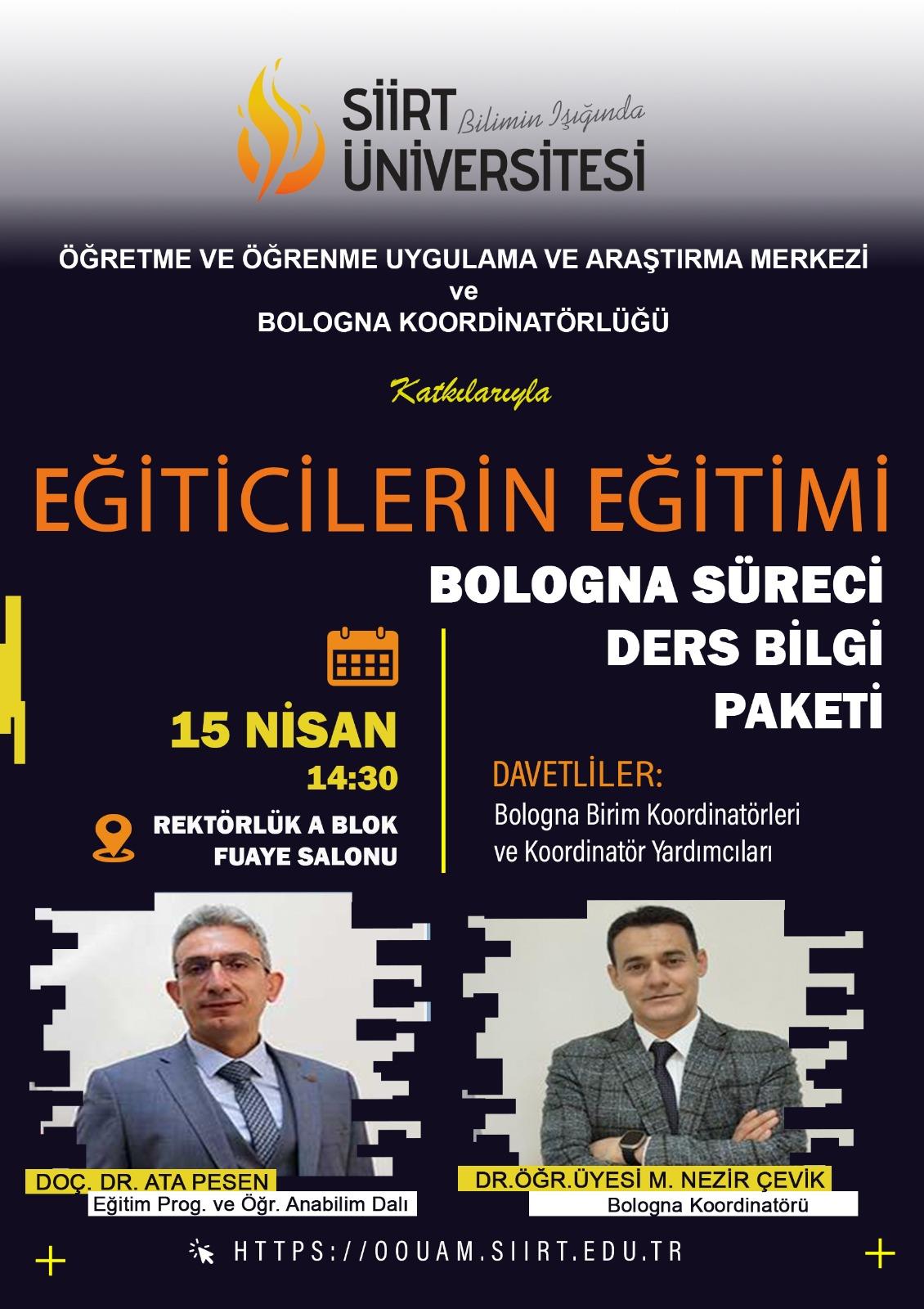 Birim Koordinatör ve Koordinatör yardımcılarına Bologna Süreci Ders Bilgi Paketi hakkında Eğiticilerin Eğitimi adı altında 15/04/2026 tarihinde saat 14.30 da Rektörlük Fuaye Salonunda program düzenlenecektir.